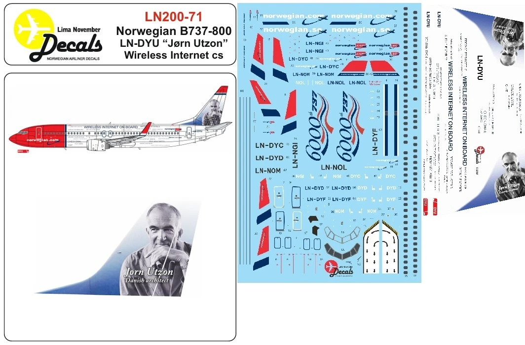 LN200-71 Norwegian B737-800 LN-DYU “Jørn Utzon/WIFI CS” 10 € LN200-71 Norwegian B737-800 LN-DYU "Jørn Utzon/WIFI CS" quantity Add to cart SKU: LN200-71 Categories: 1:200, Aircraft Decals Others Have Seen LN72-549 Linjeflyg Convair CV440. 15 € LN144-644 SAS Airbus A350-900. 12 € LN72-540 Fly Viking DHC-8-100, including Norwegian and Canadien registrations. 12 € LN72-515 Greenlandair DHC-6 Twin Otter, old scheme. Includes windows masks. 11 € LN48-13 Widerøe Stinson Reliants SR-8 & SR-9, including masks for SR-9. 12 € LN200-66 Norwegian B737-800 LN-NOM “Gretha Garbo” 10 € LN144-618 Norwegian Air Shuttle Fokker 50. 9 € LN32-D01 Royal Danish Air Force roundels. 12 €